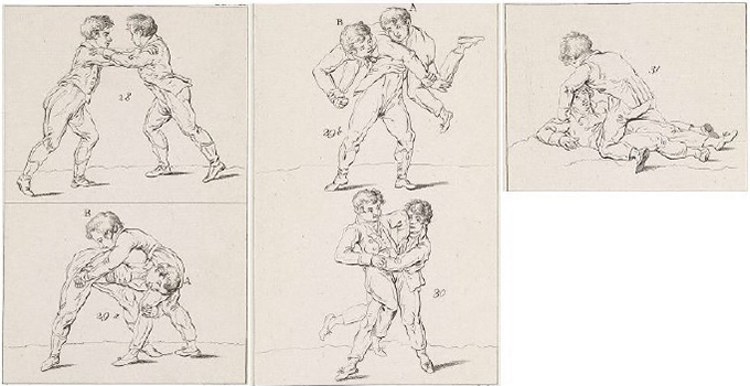 German freestyle wrestling as a form of self-defense was covered in the 1443 wrestling manual by German Hans Talhoffer of Swabia. In his book he refers to the famous Ott Jud wrestling master to the princes of Austria. This book described and included illustrations of various wrestling holds and positions known as: the beginning with equal arm grip, warding off, hip wrestling, arm lock around the hip, the throw over the head and, and several others. Leading Dutch painter Marten van Heemskerck in 1552 produced a series of sketches on fencing and Germanic wrestling. But probably the best visualization of that style was a drawing produced by the famous Dutch engraver Daniël Veelwaard (1766-1851) for the previously mentioned famous book by GutsMuths called “Gymnastics for Youth.” His drawing shows a wrestling match in five episodes, starting with the opening hold (upper arms hold), includes two ways of throwing, and finishing with the fair back fall (pinning fall). The first throw is an artistic "flying horse" performed with the wrist and knee-hold. The second throw is more pragmatic "hype" with the tight hold around the waist (bear hug). It’s interesting that Veelwaard chose to show both sides of that universal wrestling style - artistic and pragmatic.