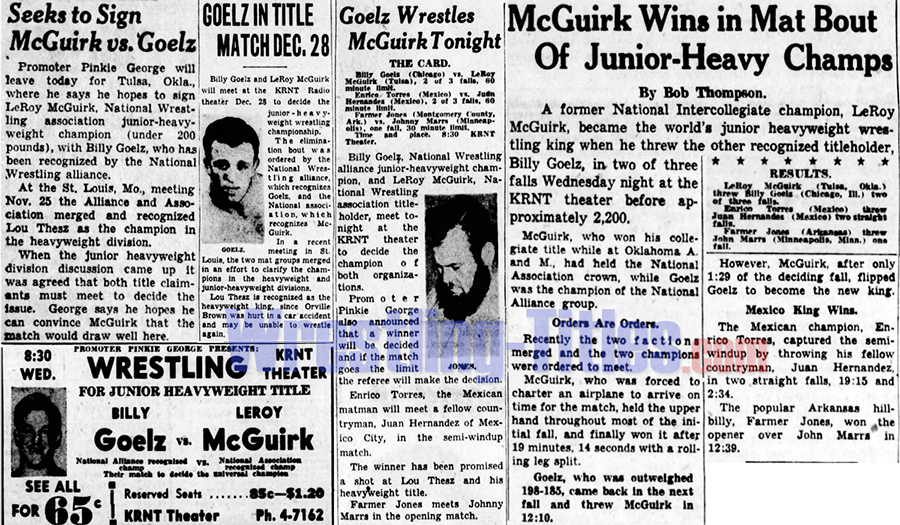 | Has won National Wrestling Association title, defeating John Swenski on 39-06-19 in Hollywood, CA; has been officially recognized as the Alliance champion at the annual meeting in 49-11; defeats Goelz on 49-12-28 to "unify" both titles; vacant on 50-02-07 when McGuirk blinded in an auto accident; Goelz continues to defend the title in Illinois and Wisconsin (at least until 51-04); Danny McShain claims the title in Oklahoma in 50-06 and 50-07. | |||||||||||||||||||||||